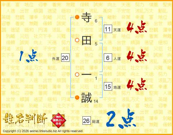 生活面を象徴する運勢です。外部から受ける影響力を表し、結婚運、家庭運や職場、環境への順応性を表します。総運から人運を引いた画数。姓や名が1文字の場合を除く。