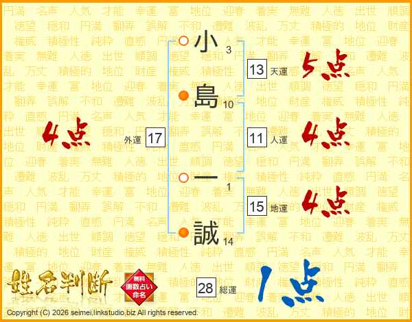 小(3画)島(10画) 一(1画)誠(14画)