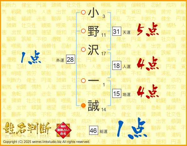 小(3画)野(11画)沢(17画) 一(1画)誠(14画)