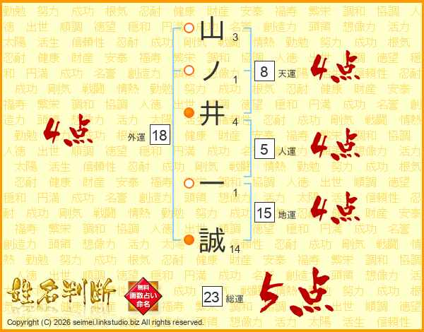 山ノ井一誠さんの総運は23画の5点!