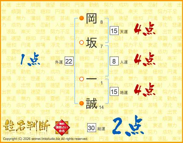 岡坂一誠さんの総運は30画の2点!