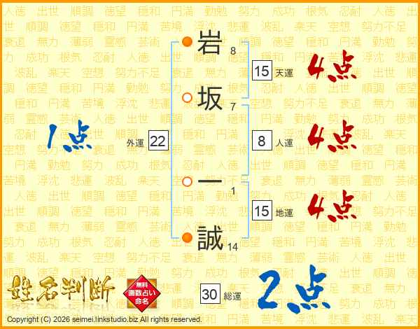 岩(8画)坂(7画) 一(1画)誠(14画)
