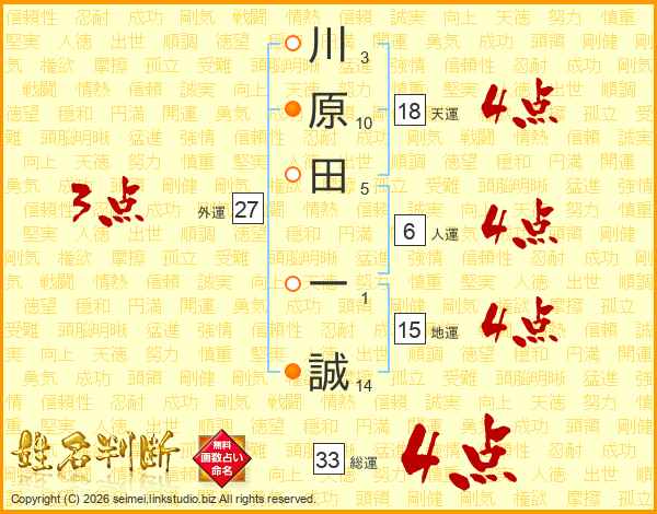 川(3画)原(10画)田(5画) 一(1画)誠(14画)