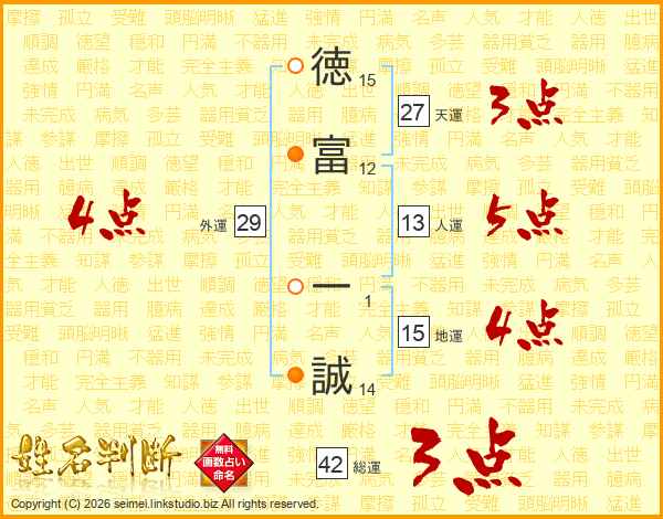徳(15画)富(12画) 一(1画)誠(14画)