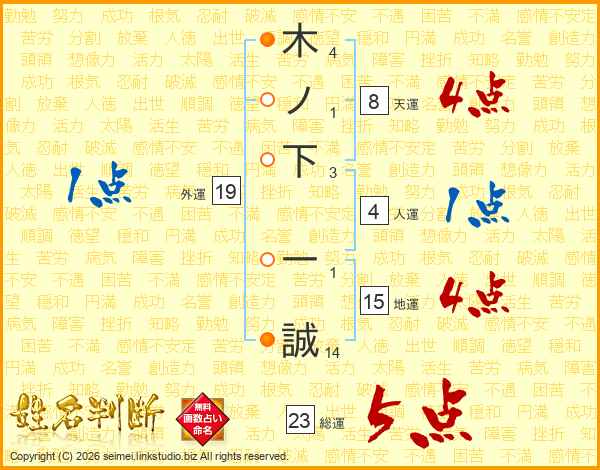 木(4画)ノ(1画)下(3画) 一(1画)誠(14画)