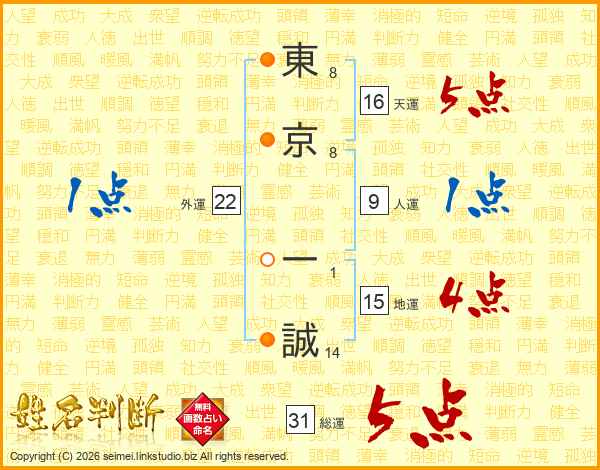 生活面を象徴する運勢です。外部から受ける影響力を表し、結婚運、家庭運や職場、環境への順応性を表します。総運から人運を引いた画数。姓や名が1文字の場合を除く。