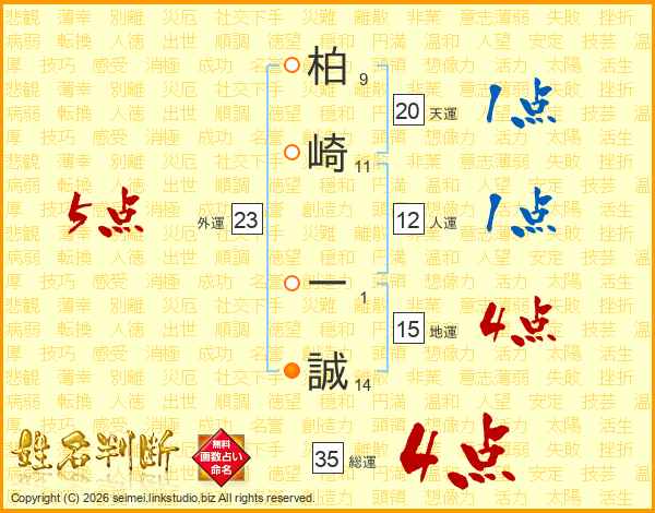 柏(9画)崎(11画) 一(1画)誠(14画)