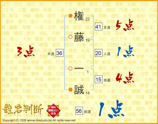 権(22画)藤(19画) 一(1画)誠(14画)