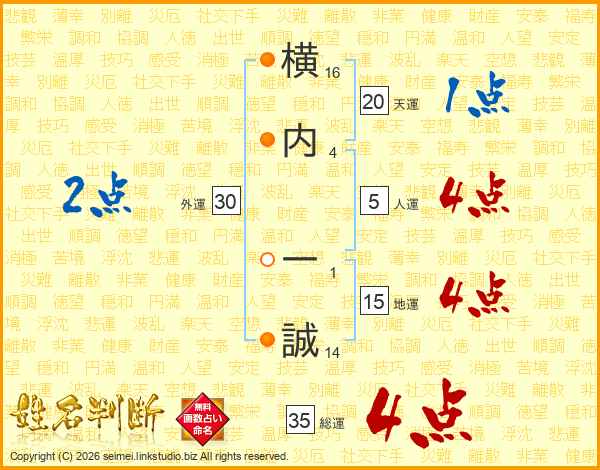生活面を象徴する運勢です。外部から受ける影響力を表し、結婚運、家庭運や職場、環境への順応性を表します。総運から人運を引いた画数。姓や名が1文字の場合を除く。