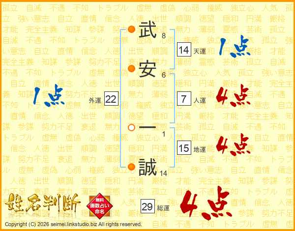 生活面を象徴する運勢です。外部から受ける影響力を表し、結婚運、家庭運や職場、環境への順応性を表します。総運から人運を引いた画数。姓や名が1文字の場合を除く。