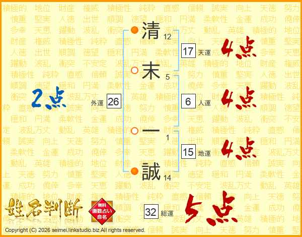 清(12画)末(5画) 一(1画)誠(14画)