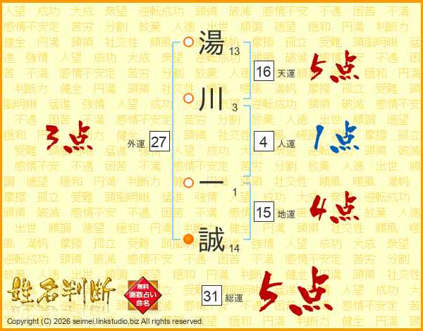 湯(13画)川(3画) 一(1画)誠(14画)