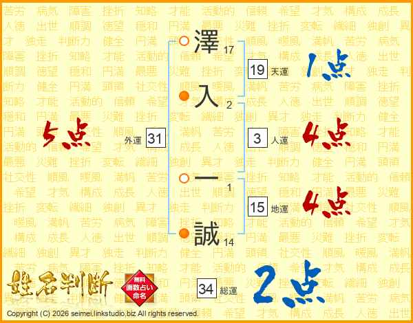 生活面を象徴する運勢です。外部から受ける影響力を表し、結婚運、家庭運や職場、環境への順応性を表します。総運から人運を引いた画数。姓や名が1文字の場合を除く。