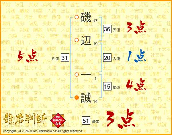 磯(17画)辺(19画) 一(1画)誠(14画)