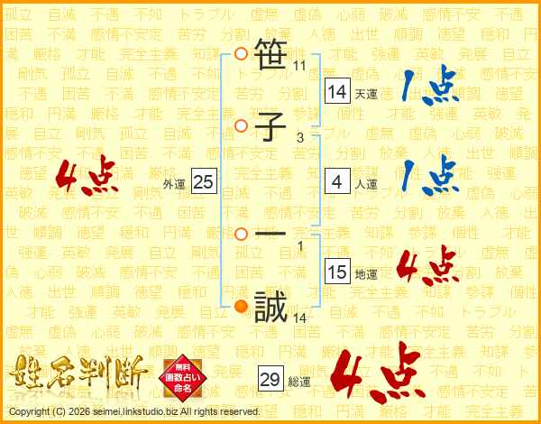 笹(11画)子(3画) 一(1画)誠(14画)
