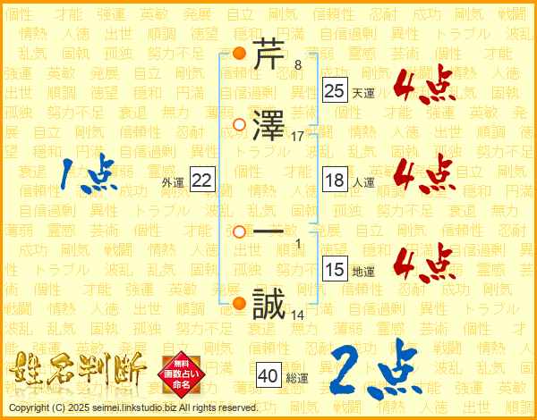 芹(8画)澤(17画) 一(1画)誠(14画)