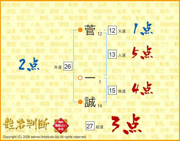 あなたの人生を表す1番重要な運勢です。生涯を通じて影響する総合運となり、主に50歳以降の晩年期に影響を及ぼします。苗字と名前の合計画数。