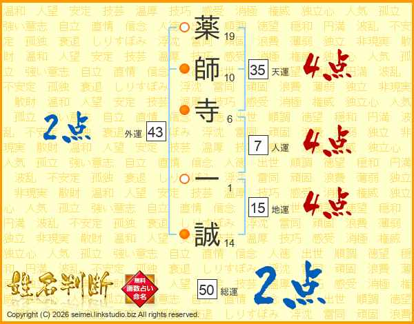 薬師寺一誠さんの総運は50画の2点!