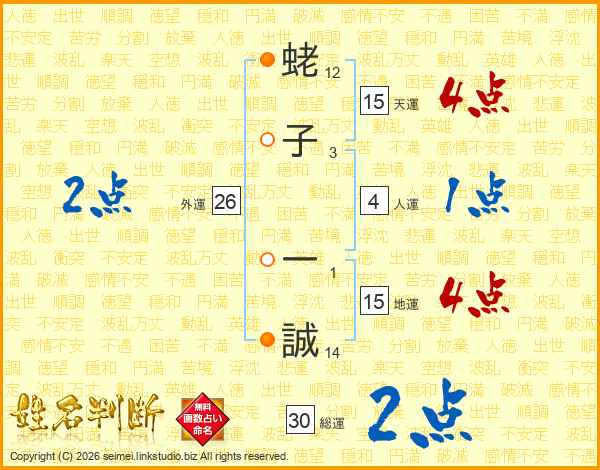 蛯(12画)子(3画) 一(1画)誠(14画)