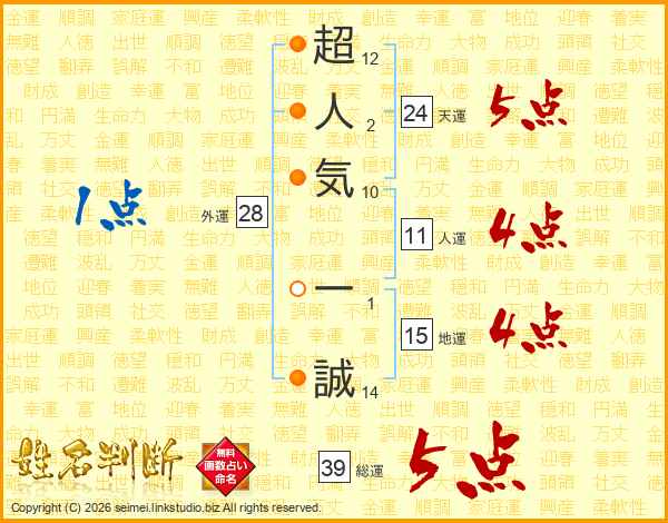 超(12画)人(2画)気(10画) 一(1画)誠(14画)