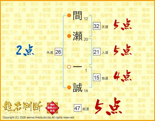 間(12画)瀬(20画) 一(1画)誠(14画)