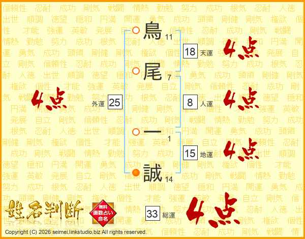 鳥(11画)尾(7画) 一(1画)誠(14画)
