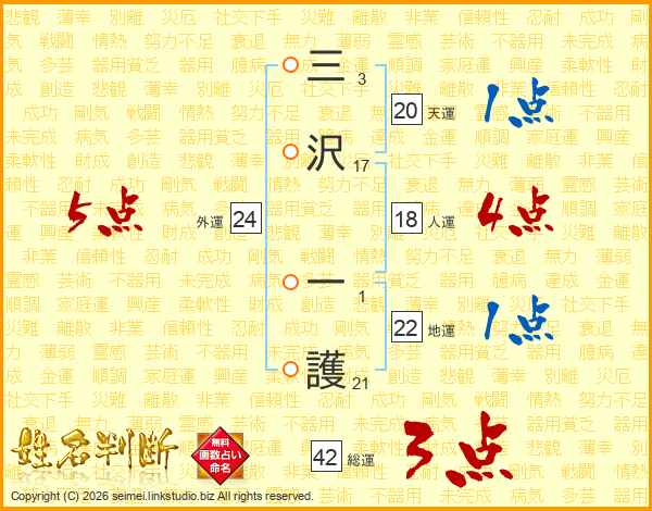 生活面を象徴する運勢です。外部から受ける影響力を表し、結婚運、家庭運や職場、環境への順応性を表します。総運から人運を引いた画数。姓や名が1文字の場合を除く。
