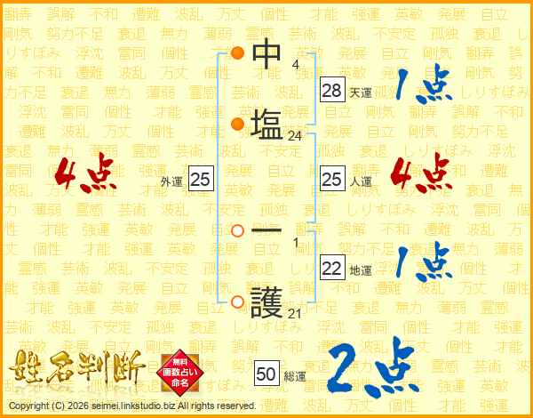 生活面を象徴する運勢です。外部から受ける影響力を表し、結婚運、家庭運や職場、環境への順応性を表します。総運から人運を引いた画数。姓や名が1文字の場合を除く。