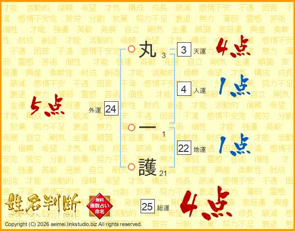 生活面を象徴する運勢です。外部から受ける影響力を表し、結婚運、家庭運や職場、環境への順応性を表します。総運から人運を引いた画数。姓や名が1文字の場合を除く。