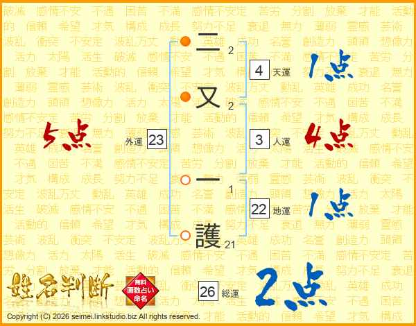 生活面を象徴する運勢です。外部から受ける影響力を表し、結婚運、家庭運や職場、環境への順応性を表します。総運から人運を引いた画数。姓や名が1文字の場合を除く。