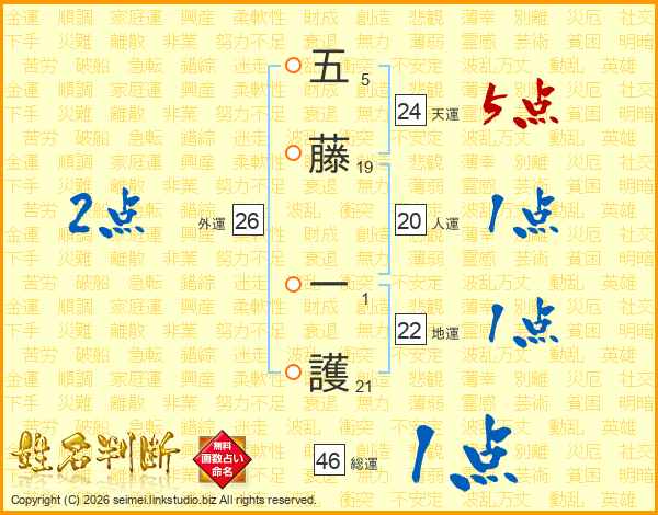 あなたの人生を表す1番重要な運勢です。生涯を通じて影響する総合運となり、主に50歳以降の晩年期に影響を及ぼします。苗字と名前の合計画数。