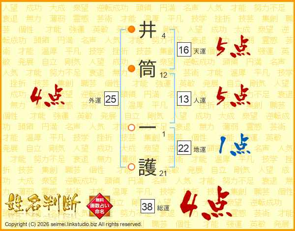 生活面を象徴する運勢です。外部から受ける影響力を表し、結婚運、家庭運や職場、環境への順応性を表します。総運から人運を引いた画数。姓や名が1文字の場合を除く。