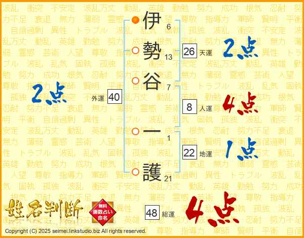 伊(6画)勢(13画)谷(7画) 一(1画)護(21画)