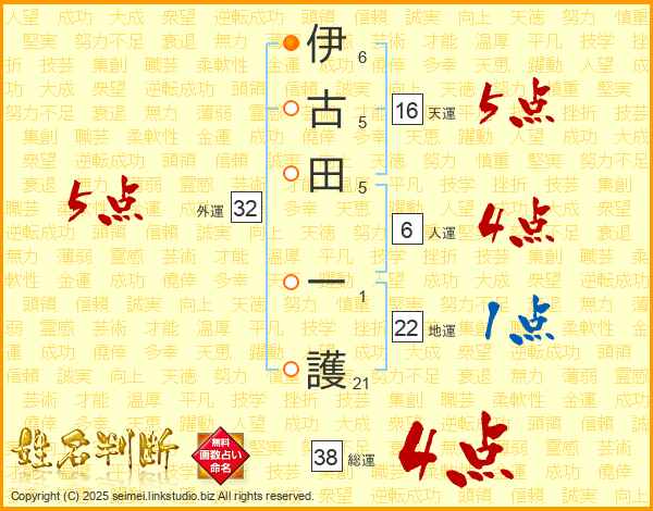 伊(6画)古(5画)田(5画) 一(1画)護(21画)