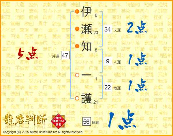 伊(6画)瀬(20画)知(8画) 一(1画)護(21画)