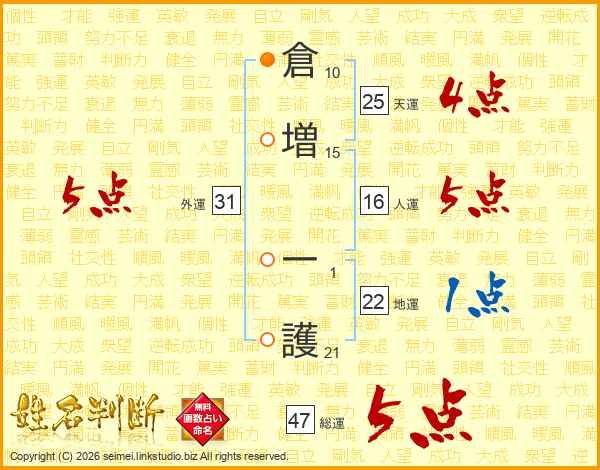 生活面を象徴する運勢です。外部から受ける影響力を表し、結婚運、家庭運や職場、環境への順応性を表します。総運から人運を引いた画数。姓や名が1文字の場合を除く。