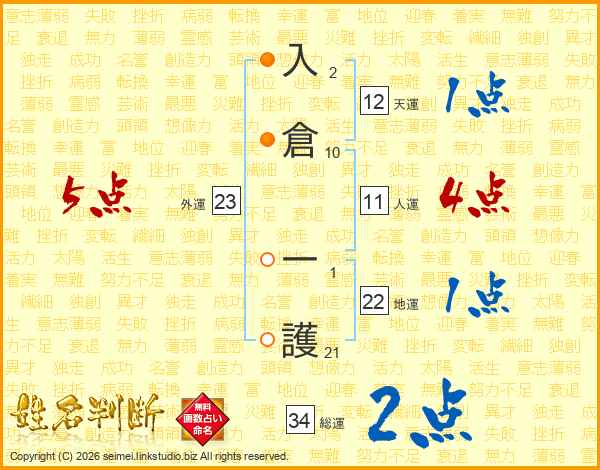 生活面を象徴する運勢です。外部から受ける影響力を表し、結婚運、家庭運や職場、環境への順応性を表します。総運から人運を引いた画数。姓や名が1文字の場合を除く。