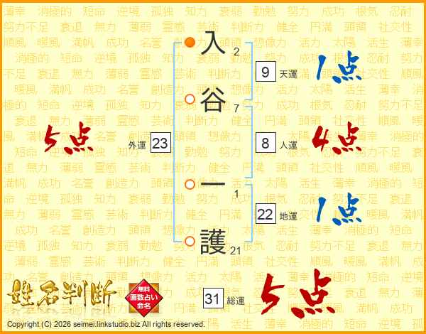 生活面を象徴する運勢です。外部から受ける影響力を表し、結婚運、家庭運や職場、環境への順応性を表します。総運から人運を引いた画数。姓や名が1文字の場合を除く。