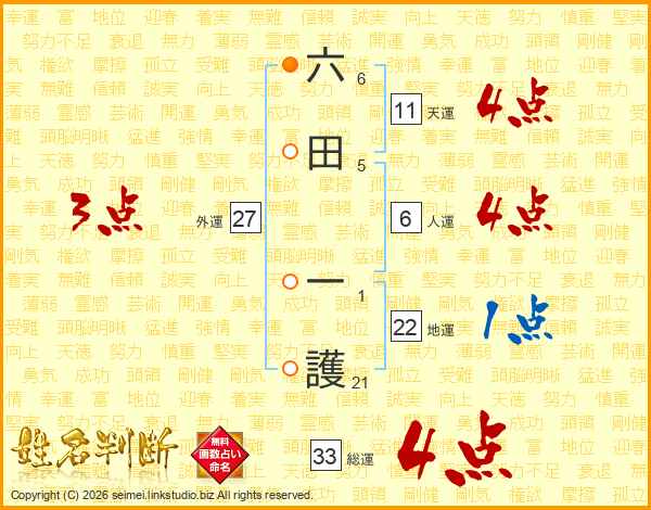 生活面を象徴する運勢です。外部から受ける影響力を表し、結婚運、家庭運や職場、環境への順応性を表します。総運から人運を引いた画数。姓や名が1文字の場合を除く。