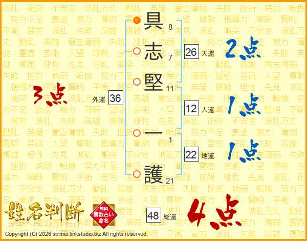 具(8画)志(7画)堅(11画) 一(1画)護(21画)