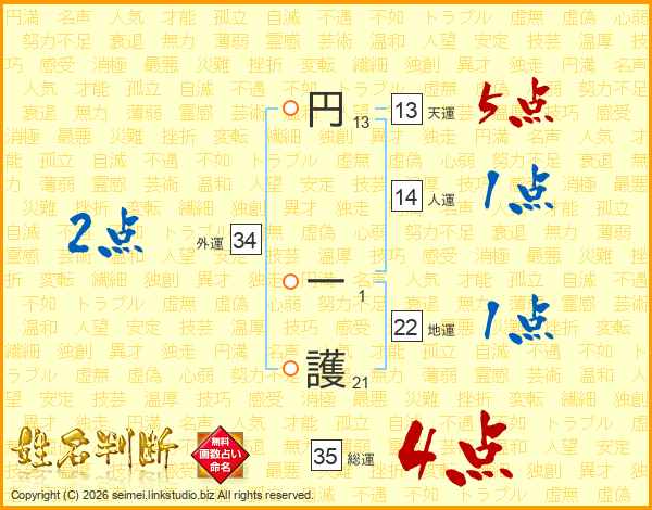 生活面を象徴する運勢です。外部から受ける影響力を表し、結婚運、家庭運や職場、環境への順応性を表します。総運から人運を引いた画数。姓や名が1文字の場合を除く。