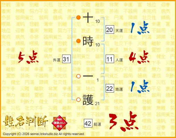 生活面を象徴する運勢です。外部から受ける影響力を表し、結婚運、家庭運や職場、環境への順応性を表します。総運から人運を引いた画数。姓や名が1文字の場合を除く。