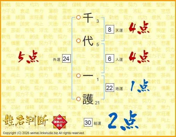 あなたの人生を表す1番重要な運勢です。生涯を通じて影響する総合運となり、主に50歳以降の晩年期に影響を及ぼします。苗字と名前の合計画数。