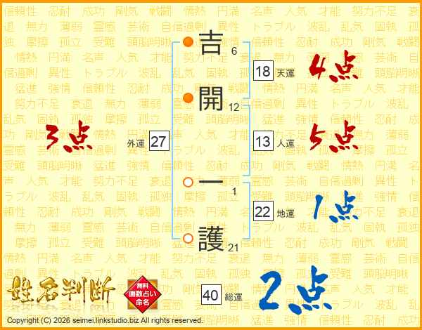 生活面を象徴する運勢です。外部から受ける影響力を表し、結婚運、家庭運や職場、環境への順応性を表します。総運から人運を引いた画数。姓や名が1文字の場合を除く。