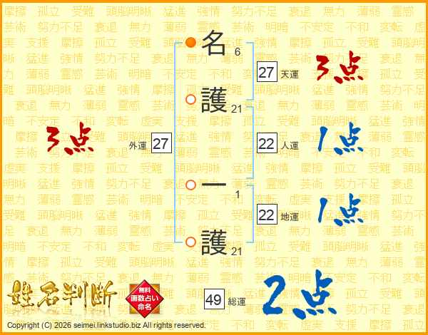 生活面を象徴する運勢です。外部から受ける影響力を表し、結婚運、家庭運や職場、環境への順応性を表します。総運から人運を引いた画数。姓や名が1文字の場合を除く。