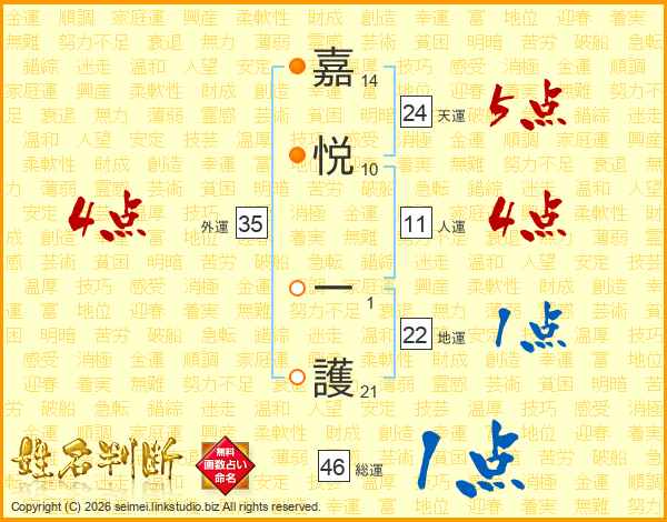 嘉(14画)悦(10画) 一(1画)護(21画)