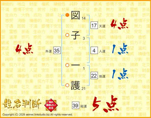 生活面を象徴する運勢です。外部から受ける影響力を表し、結婚運、家庭運や職場、環境への順応性を表します。総運から人運を引いた画数。姓や名が1文字の場合を除く。