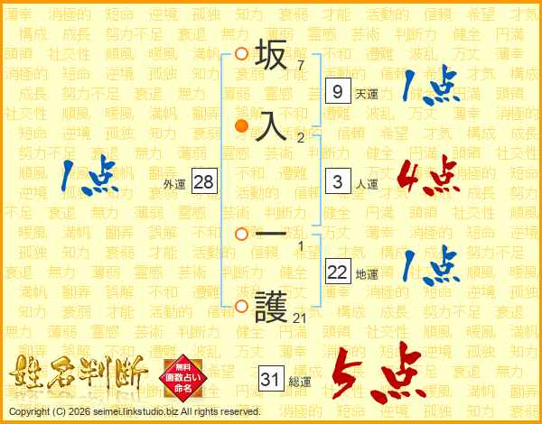 生活面を象徴する運勢です。外部から受ける影響力を表し、結婚運、家庭運や職場、環境への順応性を表します。総運から人運を引いた画数。姓や名が1文字の場合を除く。