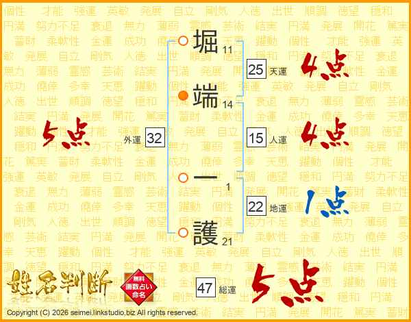 生活面を象徴する運勢です。外部から受ける影響力を表し、結婚運、家庭運や職場、環境への順応性を表します。総運から人運を引いた画数。姓や名が1文字の場合を除く。