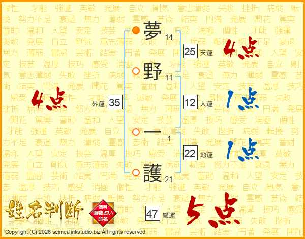 生活面を象徴する運勢です。外部から受ける影響力を表し、結婚運、家庭運や職場、環境への順応性を表します。総運から人運を引いた画数。姓や名が1文字の場合を除く。
